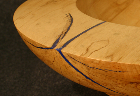 Schale aus Ahornholz, Risse im Kernbereich mit blauen Kunstharzkitt verspachtelt,