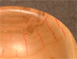 Schale aus Kirschholz, zum Kern hin sehr stark gerissen, Risse mit rotem Kunstharz verfüllt,